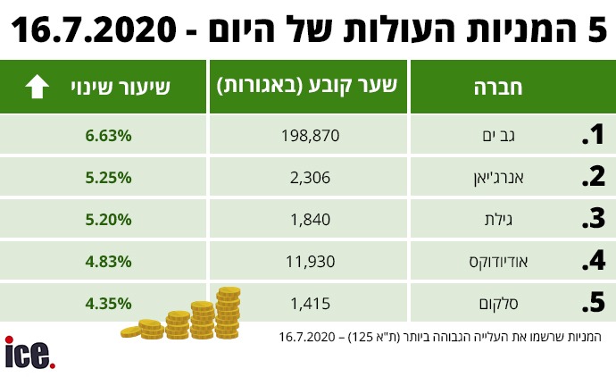 את העלייה הגדולה ביותר היום גב ים, שזינקה ב-6.63% לשער של 198,870 אגורות. במקום השני בין המזנקות נמצאת אנרג'יאן שרשמה עלייה של 5.25% לשער של 2,306 אג'. במקום השלישי גילת שרשמה עלייה של 5.2% לשער של 1,840 אג'. במקום הרביעי אודיודקס שרשמה עלייה של 4.83% לשער של 11,930 אג'. במקום החמישי בין המניות הצומחות, חברת סלקום שמזנקת ב-4.35% לשער של 1,415 אגורות.
