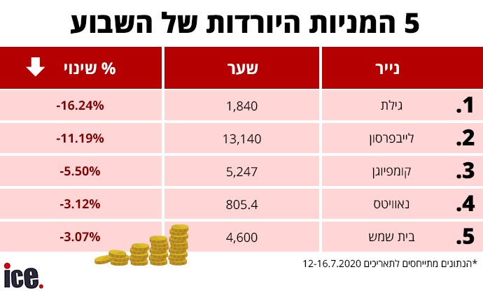 אך לא לכולן האיר השבוע שוק ההון. בקטגוריית המניות היורדות, גילת רושמת את הירידה החדה ביותר השבוע – 16.24%, וסגרה שער של 1,840 אגורות. אחריה בקטגוריית היורדות חברת לייפרסון שצנחה ב-11.19% לשער של 13,140 אגורות. במקום השלישי קומפיוגן שירדה ב-5.5% לשער של 5,247 אגורות. נאוויטס במקום הרביעי עם ירידה של 3.12% לשער של 805.4 אג', וחברת בית שמש שאיבדה 3.07% מערכה וחתמה את הרשימה השבועית.