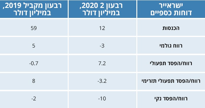 תוצאות סבירות פלוס לישראיייר ברבעון השני של 2020: למרות משבר הקורונה שגרם לקריסת ענף התעופה ברחבי העולם, ישראייר הצליחה במהלך רבעון זה להישאר, פחות או יותר, על הרגליים, עם גירעון תזרימי של מיליון דולר בלבד. זאת, למרות הפסד נקי של 10 מיליון דולר, כמעט פי חמישה מהרבעון המקביל אשתקד, אז רשמה הפסד של 2.2 מיליון דולר.