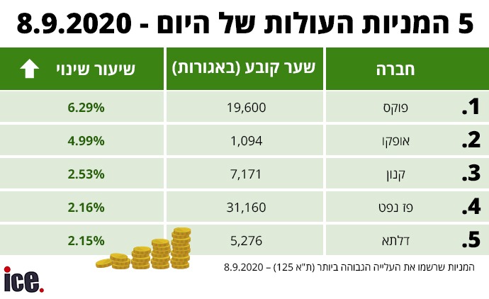בקטגוריית המניות העולות, פוקס של הראל ויזל מדורגת במקום הראשון לאחר שזינקה לשער של 19,600 אג', עלייה של 6.29%. במקום השני מדורגת אופקו עם עלייה של 4.99% לשער של 1,094 אג'. קנון במקום השלישי עם עלייה של 2.53% לשער של 7,171 אג'. פז נפט במקום הרביעי עם עלייה של 2.16% לשער של 31,160 אג'. סוגרת את החמישיה הירוקה דלתא עם עלייה של 2.15% לשער של 5,276 אג'.