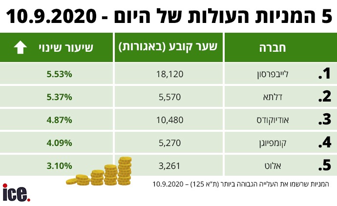 את העלייה הגדולה ביותר היום רשמה 'לייבפרסון' שזינקה ב-5.53%, וננעלה בשער של 18,120 אג'. במקום השני, חברת 'דלתא' שהגדילה את שווי המניות ב-5.37%, וננעלה בשער של 5,570 אג'. במקום השלישי 'אודיוקודס' שגדלה ב-4.87% לשער של 10,480 אג'. אחריה 'קומפיוגן' שתפסה את המקום הרביעי עם גידול של 4.09% ושער של 5,270 אג'. סוגרת את החמישיה המובילה, עם גידול של 3.1%, חברת 'אלוט', שנסגרה בשער של 3,261 אגורות.