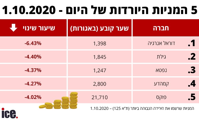 ברשימה האדומה, הירידה הגדולה ביותר בשיעור של 6.43% הוא של דוראל אנרגיה, שצנחה לשער של 1,398 אג'. גילת במקום השני עם ירידה של 4.40%, לשער של 1,845 אג'. מעט אחריה נפטא עם ירידה של 4.37%, לשער של 1,247 אג'.