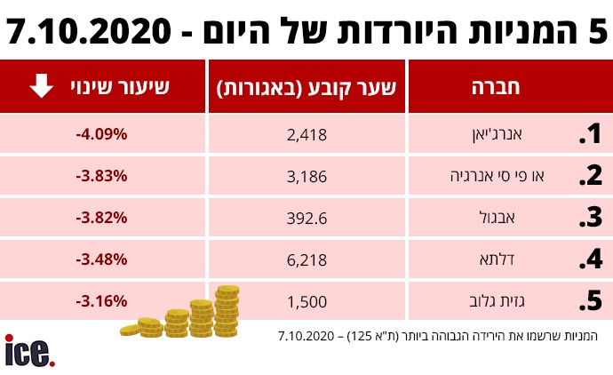את הרשימה האדומה מובילה אנרג'יאן שירדה ב-4.09% לשער של 2,418 אג'. או.פי.סי אנרגיה יורדת ב-3.83% לשער של 3,186 אג'. אבגול יורדת בשיעור דומה של 3.82% לשער של 392.6 אג'. דלתא יורדת ב-3.48% לשער של 6,218 אג'. גזית גלוב סוגרת את הרשימה האדומה עם ירידה של 3.16% ושער של 1,500 אג'. ואלו היו המניות העולות והיורדות של היום.