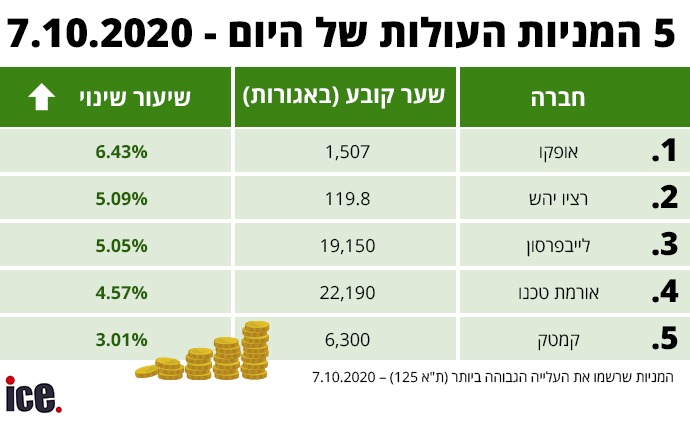 בקטגוריית המניות העולות, הרשימה הירוקה נפתחת עם עלייה של 6.43% לחברת אופקו, שהגדילה את שוויה וסגרה שער של 1,507 אג'. רציו יהש במקום השני עם עלייה של 5.09% לשער של 119.80 אג'. במקום השלישי לייבפרסון שממשיכה לטפס 5.05% נוספים, וסוגרת שער של 19,150 אג'. אורמת טכנו רושמת גידול של 4.57% לשער של 22,190 אג'. קמטק סוגרת את הרשימה הירוקה עם עלייה של 3.01% לשער של 6,300 אג'.