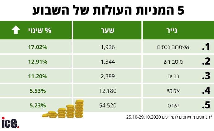 את קטגוריית המניות העולות מובילה אשטרום נכסים שטיפסה ב-17.02% לשער של 1,926 אגורות. מיטב דש שנייה בזכות עלייה נאה של 12.91% לשער של 1,344 אג'. במקום השלישי גב ים עם 11.20% ל-2,389 אג'. אלומיי במקום הרביעי המכובד הודות ל-5.53% בדרך לשער של 12,180 אג' וסוגרת את החמישייה ישרס עם 5.23% ושער של 54,520 אג'.