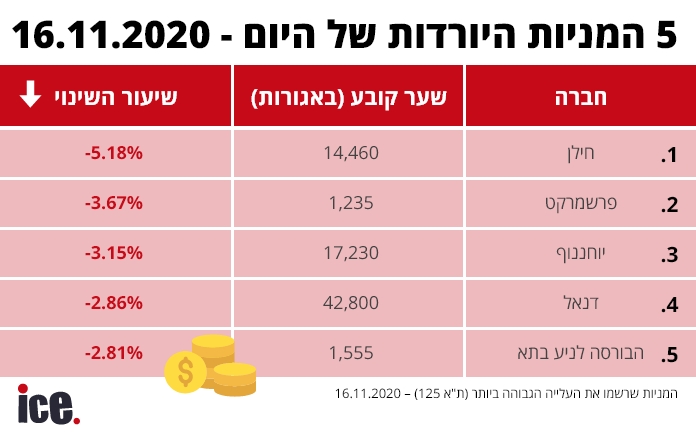 בין חמש המניות היורדות, חילן במקום הראשון לאחר שאיבדה 5.18% מערכה בדרך לשער של 14,460 אגורות, פרשמרקט ירדה ב-3.67% ל-1,235 אג', יוחננוף ירדה ב-3.15% ל-17,230 אג', דנאל איבדה 2.86% ל-42,800 והבורסה לניירות ערך ירדה ב-2.81% ל-1,555 אג'.
