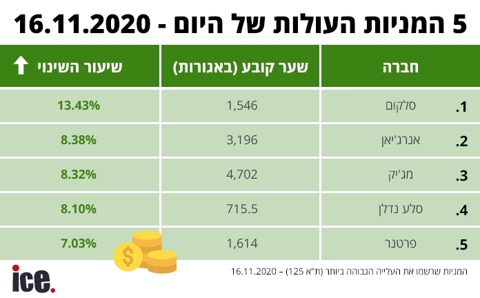 בין חמש המניות העולות, סלקום מובילה במקום הראשון עם עלייה של 13.43% בדרך לשער של 1,546 אגורות. אנרג'יאן במקום השני עם 8.38% ושער חדש של 3,196 אג'. שלישית מג'יק שהוסיפה לערכה 8.32% בדרך לשער של 4,702 אג'. סלע נדל"ן במקום הרביעי עם עלייה של 8.10% ושער של 715.5 אג' ונועלת את החמישייה פרטנר שעלתה ב-7.03% ל-1,614 אג'.