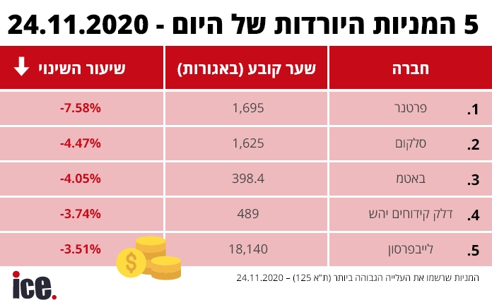 בקטגוריית המניות היורדות, פרטנר עם הירידה הגדולה ביותר של 7.58% לשער של 1,695 אג'. סלקום במקום השני עם ירידה של 4.47 ושער של 1,625 אג'. באטמ יורדת ב-4.05% לשער של 398.4 אג'. במקום הרביעי, דלק קידוחים יהש יורדת בשיעור של 3.74% ושער של 489 אג'. לייבפרסון סוגרת את הרשימה עם ירידה של 3.51% ושער של 18,140 אג'.