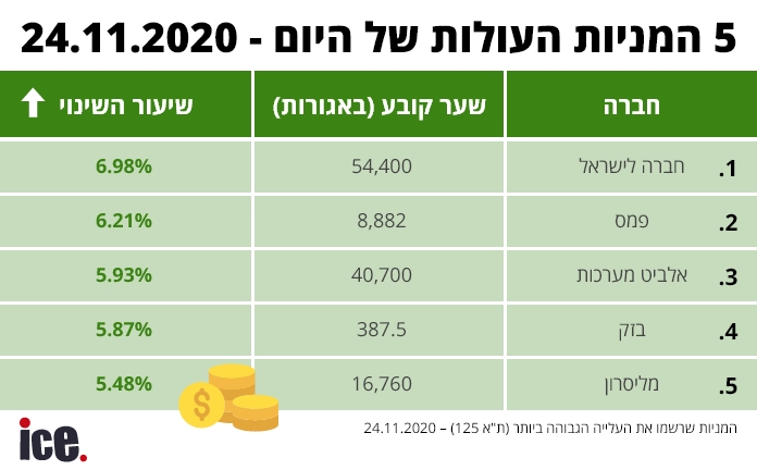 בקטגוריית המניות העולות, חברה לישראל מטפסת ב-6.98% לשער של 54,400 אג'. פמס במקום השני עם עלייה של 6.21% לשער של 8,882 אג'. אלביט מערכות במקום השלישי לאחר שהוסיפה לשוויה עוד 5.93% ונסגרה בשער של 40,700 אג'. סוגרות את הרשימה בזק עם עלייה של 5.87% ושער של 387.5 אג' ואחרונה מליסרון עם עלייה של 5.48%.