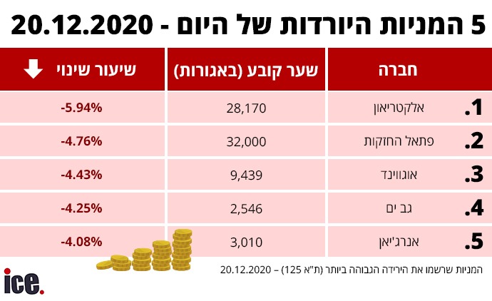 בקטגוריית המניות היורדות, אלקטריאון עם הירידה הגדולה ביותר של 5.94% לשער של 28,170 אג'. פתאל החזקות נמצאת במקום השני עם ירידה של 4.76% ושער של 32,000 אג'. אוגווינד יורדת ב-4.43% לשער של 9,439 אג'. במקום הרביעי נמצאת גב ים שיורדת ב-4.25% ושער של 2,546 אג'. אנרג'יאן סוגרת את הרשימה עם ירידה של 4.08% ושער של 3,010 אג'.
