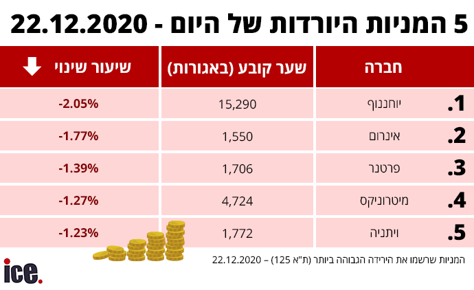 בקטגוריית המניות היורדות: במקום הראשון מניית יוחננוף עם ירידה של 2.05% ל-15,290 אג'. אחריה: אינרום על ירידה של 1.77% ל-1,550 אג'.