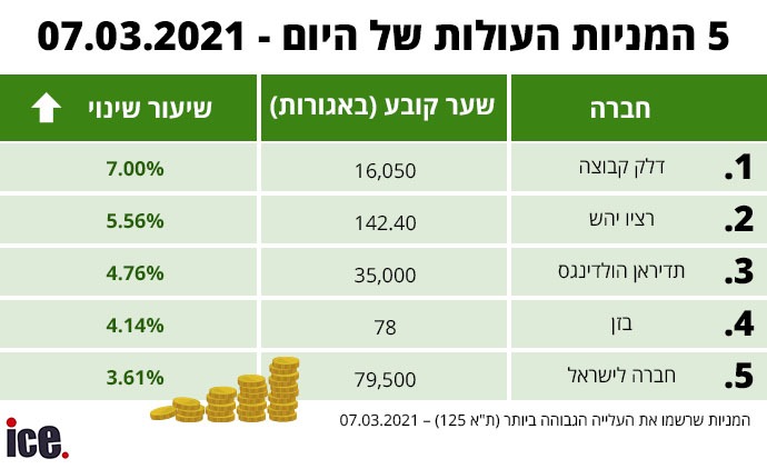 במניות העולות, דלק קבוצה רושמת עלייה של 7.00% עם שער של 16,050אג', במקום השני רציו יהש עם עלייה של 5.56% ל-142.40 אג', תדיראן הולדינגס שלישית עם 4.76% ושער חדש של 35,000 אג'. רביעית בזן שהוסיפה 4.14% לערכה בדרך ל-78 אג', סוגרת את החמישייה חברה לישראל שעלתה ב-3.61% ל-79,500 אג'.