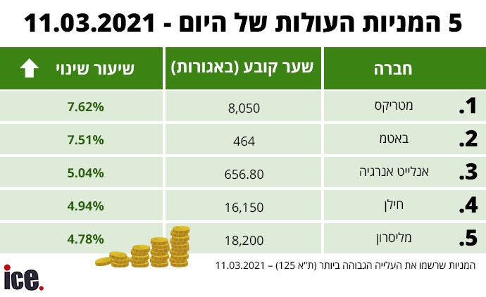 בקטגוריית המניות העולות של היום, מניית מטריקס עם זינוק של 7.62% לשער של 8,050 אג', אחריה: באטמ עם עלייה של 7.51% לשער של 464 אג'. במקום השלישי: מניית אנלייט אנרגיה עלתה בשיעור של 5.04% לשער של 656.80 אג', אחריה: חילן עם עלייה של 4.94% לשער של 16,150 אג'. סוגרת את הרשימה: מליסרון עם עלייה של 4.78% ל-18,200 אג'.