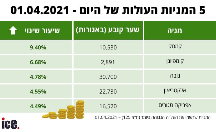 במניות העולות ניתן למצוא את קמטק שתופסת את הפסגה עם עלייה של 9.40% לשער של 10,530 אג', כאשר קומפיוגן במקום השני עם עלייה של 6.68% לשער של 2,891 אג', נובה במקום השלישי עם עלייה של 4.78% לשער של 30,700 אג', אלקטריאון במקום הרביעי עם עלייה של 4.55% לשער של 22,730 אג' וסוגרת את החמישייה אפריקה מגורים שטיפסה ב-4.49% לשער של 16,520 אג'.