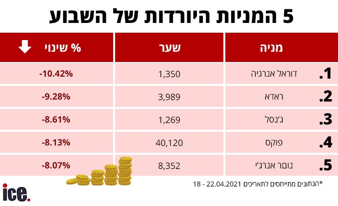 את המניות היורדות מוליכה דוראל אנרגיה שירדה ב-10.42% בדרך לשער של 1,350 אג', ראדא צנחה ב-9.28% ל-3,989 אג', ג'נסל איבדה 8.61% וירדה ל-1,269 אג'. פוקס רביעית עם ירידה של 8.13% לשער של 40,120 אג', נופר אנרג'י סוגרת את החמישייה עם ירידה של 8.07% בדרך לשער של 8,352 אג'.