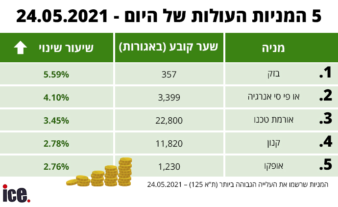 במניות העולה של היום: מניית בזק עשתה את העלייה הגדולה ביותר בשיעור של 5.59% ל-357 אג'. או פי סי אנרגיה עם עלייה של 4.10% לשער של 3,399 אג'. מניית אורמת טכנו עלתה בשיעור של 3.45% לשער קובע של 22,800 אג'. מניית קנון עלתה ב-2.78% ל-11,820 אג'. ומניית אופקו נועלת את חמישיית העולות עם עלייה של 2.76% לשער של 1,230 אג'.