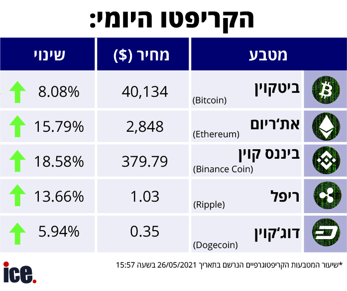 יממה טובה עברה על המטבעות הקריפטוגרפיים. היום (רביעי) נכון לשעה 15:57 המטבעות רשמו התאוששות מהנפילה בערך שלהם בתחילת השבוע האחרון, והיום כל המטבעות רשמו עלייה בערכם כשהביננס עשה את העלייה הגדולה ביותר.
