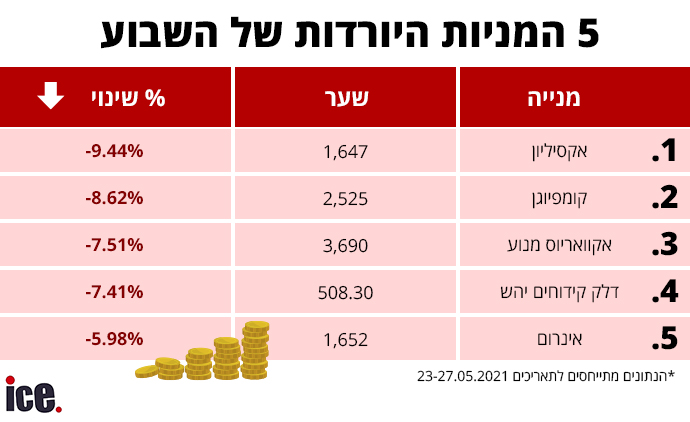 במניות היורדות של השבוע, מניית אקסיליון רשמה ירידה השבוע בשיעור של 9.44% לשער של 1,647 אג'. מניית קומפיוגן עם ירידה בשיעור של 8.62% לשער של 2,525 אג'. אקוואריוס מנוע עם ירידה של 7.51% לשער של 3,690 אג'. מניית דלק קידוחים יהש עשתה ירידה בשיעור של 7.41% לשער של 508.30 אג'. מניית אינרום עם ירידה של 5.98% לשער של 1,652 אג'.