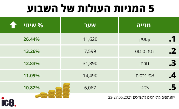 במניות העולות של השבוע: מניית קמטק עשתה את העלייה הגדולה ביותר של השבוע בשיעור של 26.44% לשער של 11,620 אג'. מניית דניה סיבוס עשתה את העלייה השנייה של השבוע בשיעור של 13.26% לשער של 7,599 אג'. מנייה נובה עלתה בשיעור של 12.83% בשער של 31,890 אג'. מניית אפי נכסים עם עלייה של 11.09% לשער של 14,490 אג'. מניית אלוט עם עלייה בשיעור של 10.82% לשער של 6,067 אג'.
