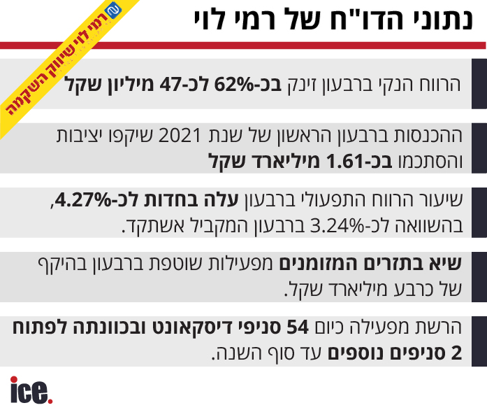 רשת הקמעונאות סיכמה את הרבעון הראשון של 2021: הרווח הנקי עומד על 47 מיליון שקל, שיעור הרווח התפעולי ברבעון עלה בחדות לכ-4.27%, בהשוואה לכ-3.24% ברבעון המקביל אשתקד. עד סוף חודש אוגוסט 2021, החברה תשיק מרכז לוגיסטי חדש "רמי לוי לעסקים"