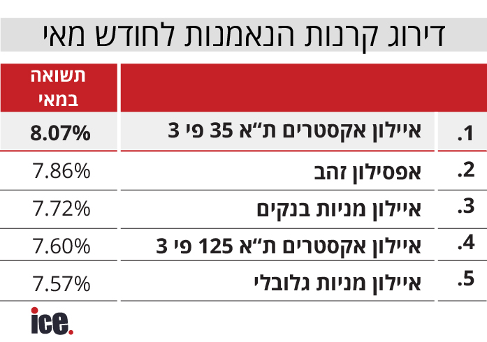 כשבוחנים את התשואות של קרנות הנאמנות בחודש מאי מגלים שאיילון הכניסה 4 קרנות לרשימת 5 הקרנות הטובות של החודש. במקום הראשון הייתה זו הקרן איילון אקסטרים ת"א 35 פי 3 שהניבה תשואה של 8%. במקום השני הייתה זו הקרן אפסילון זהב שהניבה תשואה של 7.86%.