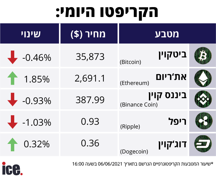 יתר הנתונים נכון לשעה 16:00: הביטקוין, ירד מרף ה-36 אלף דולר לאחר שירד ביממה האחרונה ב-0.46% לשער של 35,873 דולר, הביננס קוין עם ירידה קלה בשיעור של 0.93% לשער של 387.99 דולר. הריפל עם ירידה קלה גם כן בשיעור של 103% ל-93 סנט. והדוג'קוין ממשיך כבר יממה שנייה בעלייה שלו עם עלייה בשיעור של 0.32 לשער של 36 סנט.