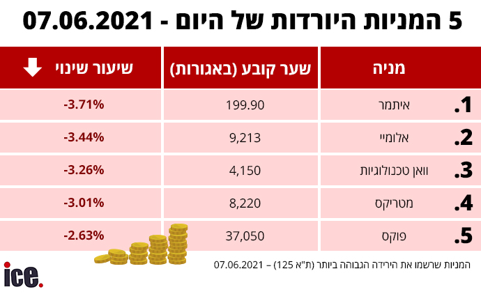 מנגד, המניה שרשמה את הירידה החדה ביותר היתה זו של איתמר מדיקל, שירדה ב-3.71% לשער של 199.90 אג', ואחריה אלומיי קפיטל שירדה ב-3.44% לשער של 9.213 אג', וואן טכנולוגיות שספגה ירידה של 3.26% לשער של 4.150 אג', מטריקס שירדה בשיעור של 3.01% לשער של 8,220 אג' ורשת פוקס שרשמה ירידה של 2.63% לשער של 37,050 אג'.
