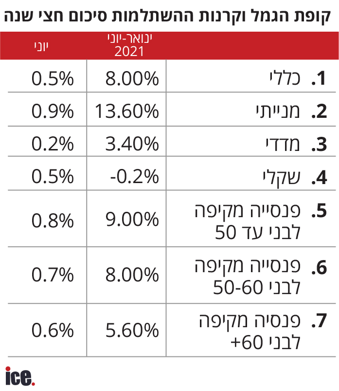 שנת 2021 הולכת להיות שנה מדהימה לתעשיית קופות הגמל. מניתוח שבוצע בבית ההשקעות מיטב-דש עולה כי קופות הגמל הניבו תשואה של 8% מתחילת השנה כשבחודש יוני לבדו הניבו הקופות תשואה של 0.5%.