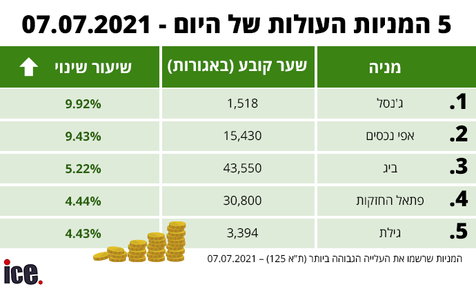 בחמישיה הפותחת של המניות העולות להיות נמצאות ג'נסל ואפי נכסים שהביאו שתיהן עליה משמעותית היום. בהמשך הרשימה גם מניית ביג שעלתה לכותרות עם הרכישה המשמעותית של אלטשולר שחם.