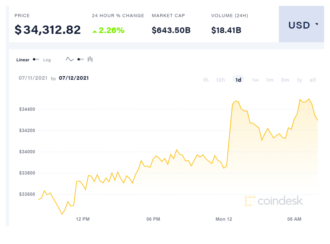 המטבע הבכיר עלה בשיעור של 2.26% בדרך לשער חדש של 34,312.82 דולר, כאשר שווי השוק של הביטקוין נסק ל-643.50 מיליארד דולר בסך הכל. יש לציין שבמהלך הלילה הערך של המטבע כבר נשק ל-35 אלף דולר, אך לא הצליח לחצות את הרף.