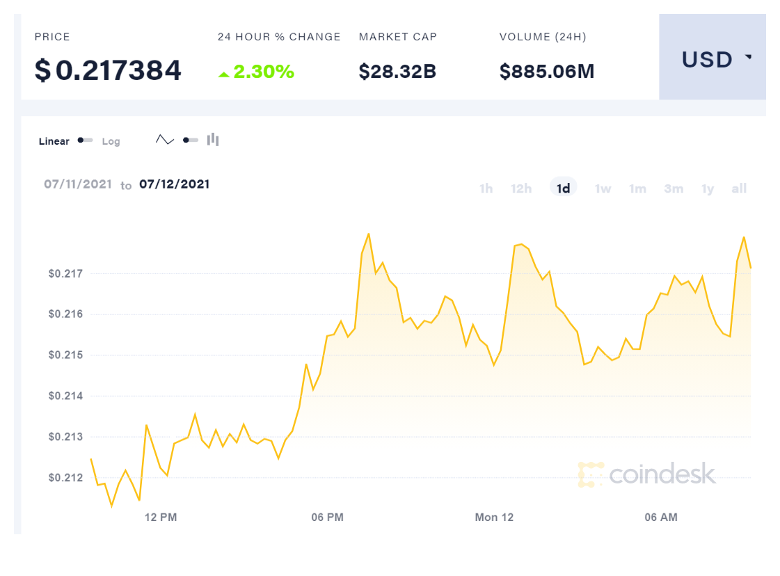 הדוג'קוין בהמשך לעלייה של השניים הבכירים גם כן נהנה מרוח גבית והתחזק ב-2.30% והגיע לשווי חדש של 0.217 דולר בסך הכל, שווי השוק של המטבע הדיגיטלי הגיע ל-28.32 מיליארד דולר בסך הכל.