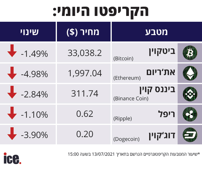 האת'ריום חווה את הירידה המשמעותית ביותר עם ירידה של כמעט 5% למטבע שמחירו עומד כעת על 1,997.04 דולר. גם הדוג'קוין עם ירידה משמעותית של 3.9% למחיר נמוך מאוד של 0.20 דולר למטבע של מאסק. הריפל עם ירידה של 1.10% למחיר של 0.62 דולר. ביננס קוין בירידה של 2.84% למחיר של 311.74 דולר. הביטקוין חווה גם הוא ירידה של 1.49% לערך של 33,038.2 דולר.
