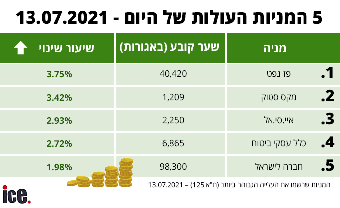 איי.סי.אל במקום השלישי עם עליה של 2.93% נעמדת על שער של 2,250 אג'. מניית כלל עסקי ביטוח במקום הרביעי למניות העולות עם עליה של 2.72% ושער של 6,865 אג'. חברה לישראל סוגרת את החמישיה עם עליה של 1.98% ושער של 98,300 אג'.
