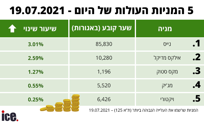בכל זאת, את המניות העולות של היום מובילה עם נייס עם עלייה של 3.01% לשער של 85,830 אג', כאשר אילקס מדיקל טיפסה ב-2.59% ל-10,280 אג', מקס סטוק במקום השלישי לאחר שעלתה ב-1.27% ל-1,196 אג', מג'יק רביעית לאחר עלייה של 0.55% ל-5,520 אג'. סוגרת את החמישייה ויקטורי שעלתה ב-0.25% בסך הכל לשער חדש של 6,426 אג'.