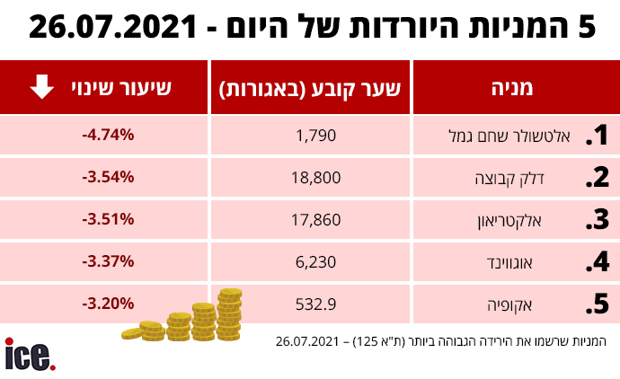 ברשימת המניות היורדות אלטשולר שחם גמל תופסת את המקום הראשון עם ירידה של 4.74%- לשער של 1,790 אג'. דלק קבוצה יורדת גם היא ומגיעה למקום השני עם ירידה של 3.54%- לשער של 18,800. אלקטריאון במקום השלישי מאבדת מערכה 3.15%- ומגיעה לשער של 17,860 אג'. אוגווינד במקום הרביעי, יורדת בשיעור של 3.37%- לשער של 6.230 אג'. אקופיה סוגרת את הרשימה עם שיעור ירידה של 3.20%- ושערה כעת 532.9 אג'.