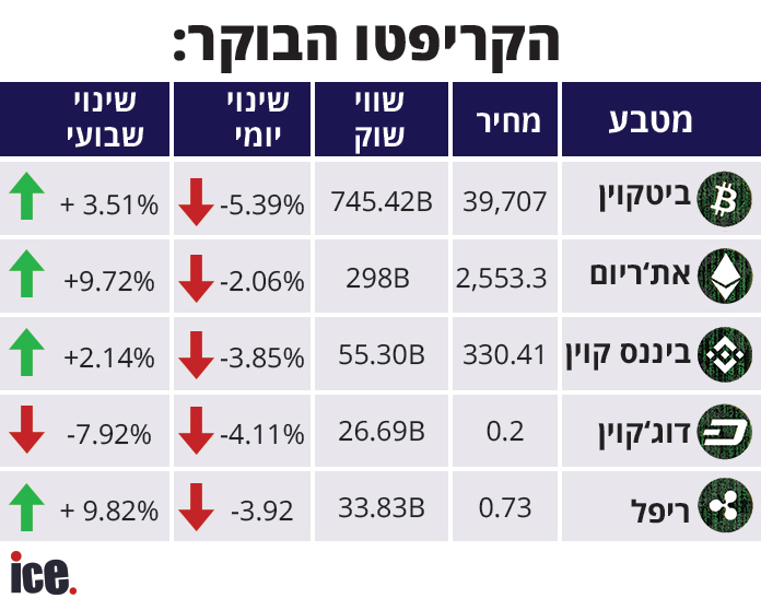 האת'ריום יורד ב-2.06% למחיר של 2,553.3 דולר ושווי שוק של של 298 מיליארד דולר. עם זאת, האת'ריום עדיין מחזיק ביציבות בעליה השבועית שלו שעומדת 9.72%. הביננס קוין מצטרף למגמת הירידה ומאבד ביממה האחרונה 3.85% ויורד למחיר של 330.41 דולר עם שווי שוק של 55.30 מיליארד דולר. בשינוי השבועי הביננס קוין הולך ויורד ועומד על עליה שבועית של 2.14%.