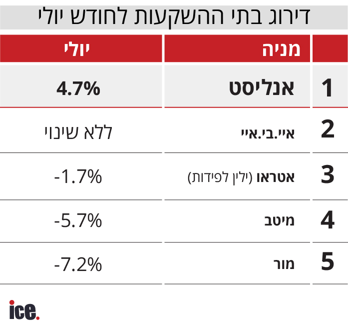 הכוכבים של התקופה האחרונה היו מור, אלטשולר וכן הלאה אבל מה שקרה שאי.בי.אי החל להדביק את הפער ואיתו גם מיטב, אבל את המהלך של חודש יולי עשה בית ההשקעות אנליסט שדשדש בשנה האחרונה והמניה שלו הפכה להיות אופציית השקעה מעניינת למי שמעוניין להיחשף לתחום.