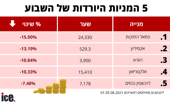 בראש טבלת המניות היורדות, ניתן למצוא את פתאל החזקות שרשמה התרסקות של 15% בדרך ל-24,330 אג', אקסיליון שנייה אחרי ירידה של 13.19% ושער של 529.3 אג', ראדא שלישית עם ירידה של 10.84% ל-3,900 אג', אלקטריאון למרות המינוי של הנשיא לשעבר רובי ריבלין לנשיא החברה, ירדה ב-10.33% לשער של 15,410 אג', סוגרת את החמישייה לוינשטין נכסים שאיבדה 7.48% מערכה בדרך ל-7,178 אג'.