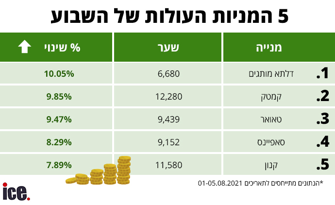 את טבלת המניות העולות של השבוע מוליכה דלתא מותגים, שחוותה עלייה משמעותית של 10.05% לשער חדש של 6,680 אג', בעיקר בזכות דוח הרבעון השני החיובי שלה, קמטק גם היא טיפסה בזכות הדוחות, ב-9.85% ל-12,280 אג'. טאואר במקום השלישי בזכות עלייה של 9.47% ל-9,439 אג', שהייתה המנייה המטפסת ביותר ביום רביעי נסקה ב-8.29% ל-9,152 אג', קנון סוגרת את החמישייה עם עלייה של 7.89% ל-11,580 אג'.