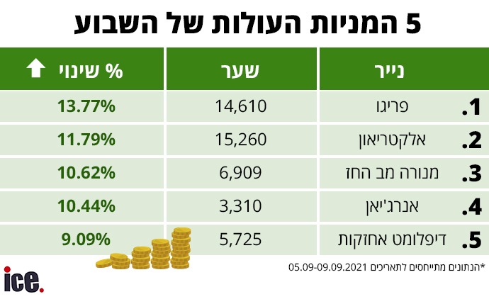 המניות העולות של השבוע הן פריגו, אלקטריאון, מנורה מב החז, אנרג'יאן ודיפלומט אחזקות. מקום הראשון מניית פריגו שרשמה השבוע צמיחה בשיעור של 13.77% לשער קובע של 14,610 אג'. אלקטריאון עם עליה של 11.79% לשער של 15,260 אג', מניית מנורה מבטחים החזקות עם צמיחה שבועית של 0.62 לשער מניה של 6,909 אג'.