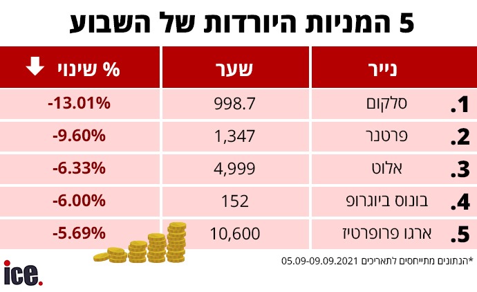 במניות היורדות של השבוע חברות התקשורת הסלולארית מככבות כשסלקום מאבדת את הנתח הגבוה ביותר עם שיעור שינוי של 13.01%- לשער של 998.7 אג' ופרטנר מתמקמת שניה עם ירידה של 9.6%- לשער של 1,347 אג'.