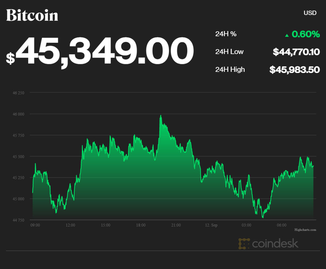 הביטקוין רשם עלייה של 0.60% בסך הכל בדרך לשער של 45,349 דולר בסך הכל, כאשר שווי השוק שלו טיפס ל-853.17 מיליארד דולר בסך הכל. רק לפני פחות מ-24 שעות היה המטבע מתחת ל-45 אלף דולר.