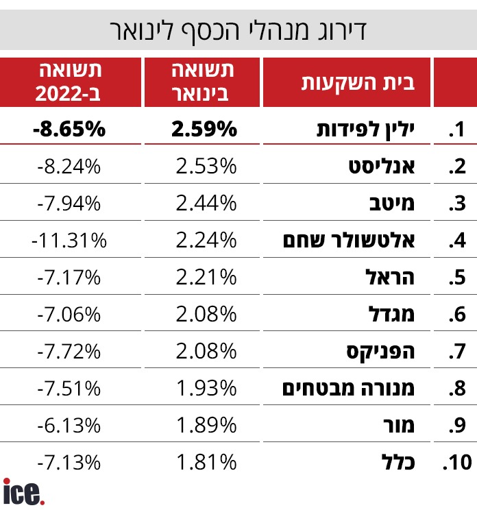 את הביצועים הטובים ביותר השיגו בחודש ינואר בתי ההשקעו ילין לפידות ואנליסט, שני בתי השקעות שנחשבים לפעילים מאוד בשוק. במקום השלישי נמצא בית ההשקעות מיטב ולאחריו בית ההשקעות אלטשולר שחם.
