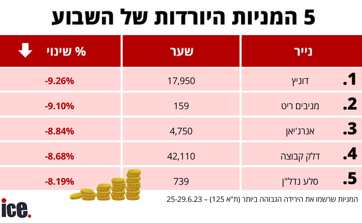 ברשימת המניות היורדות במדד נראה את דוניץ במקום הראשון, עם ירידה של 9.26% לשער של 17,950 אגורות. במקום השני נמצאת מניבים ריט שיורדת ב-9.10% לשער של 159 אגורות. אנרג'יאן נמצאת במקום השלישי עם ירידה של 8.84% לשער של 4,750 אגורות. במקום הרביעי דלק קבוצה עם ירידה של 8.68% לשער של 42,110 אגורות. סלע נדל"ן סוגרת את הרשימה עם ירידה של 8.19% לשער של 739 אגורות.