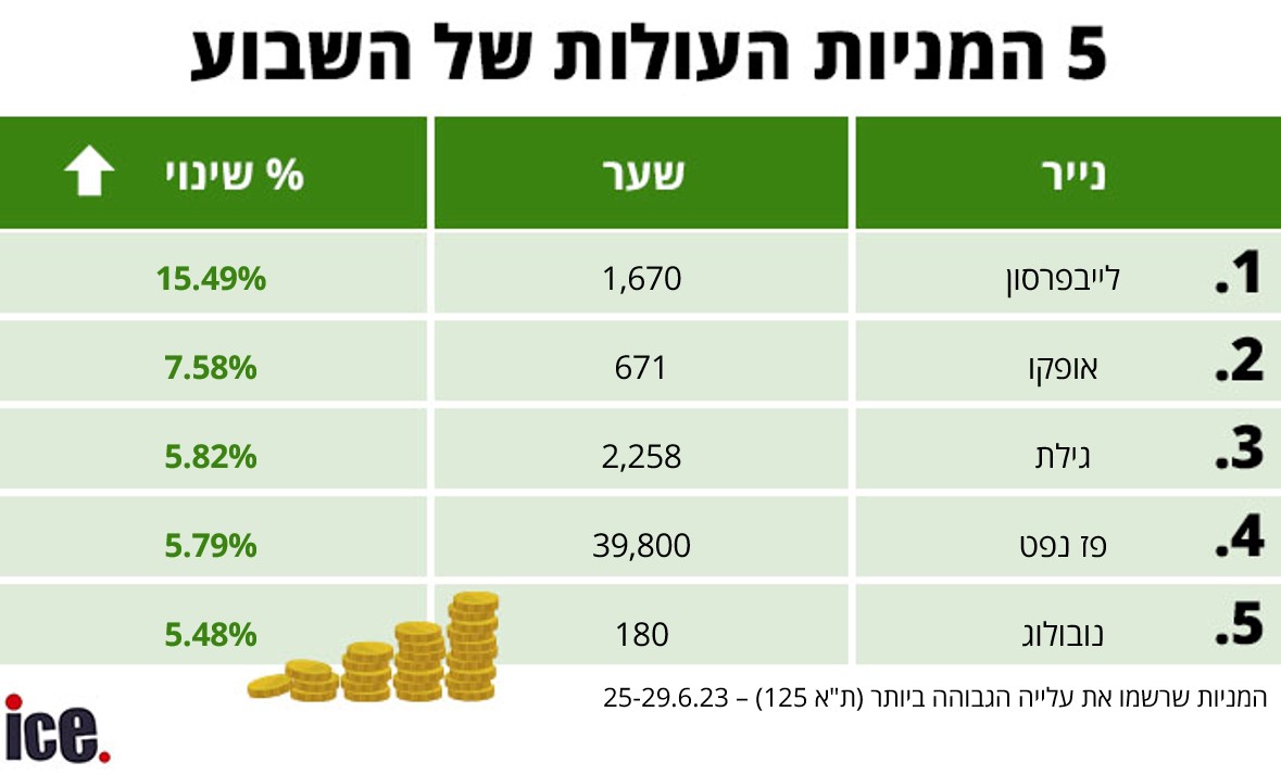 ברשימת המניות העולות השבוע לייבפרסון מובילה עם עלייה של 15.49% לשער של 1,670 אגורות. אופקו נמצאת השבוע במקום השני עם עלייה של 7.58% לשער של 671 אגורות. גילת במקום השלישי עולה ב-5.82% לשער של 2,258 אגורות. במקום הרביעי פז נפט עם עלייה של 5.79% לשער של 39,800 אגורות. נובולוג סוגרת את הרשימה עם עלייה של 5.48% לשער של 180 אגורות.
