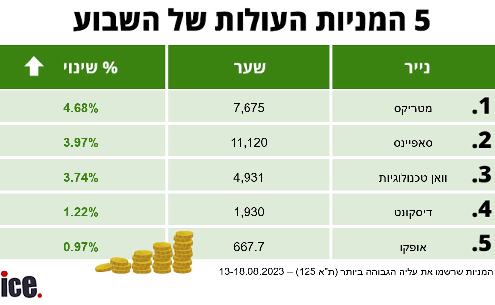 החמישייה הפותחת של המניות העולות של השבוע במדד ת"א 125 לא מציגה הפעם עליות מרשימות במיוחד. מטריקס נמצאת במקום הראשון עם עלייה של 4.68% לשער של 7,675 אגורות. במקום השני סאפיינס עם עלייה של 3.97% לשער של 11,120 אגורות. וואן טכנולוגיות במקום האמצעי עם עלייה של 3.74% לשער של 4,931 אגורות.