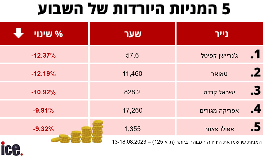 לעומת החמישייה העולה, המניות האדומות מציגות ירידות גדולות יותר. ג'נריישן קפיטל נמצאת במקום הראשון עם ירידה של 12.37% לשער של 57.6 אגורות. טאואר שומרת על המיקום השני משבוע שעבר עם ירידה של 12.19% לשער של 11,460 אגורות. ישראל קנדה יורדת השבוע ב-10.92% לשער של 828.2 אגורות והיישר למקום השלישי.