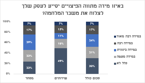 30% מהעסקים בתחום המסחר והשירותים בישראל סבורים שמתווה הפיצויים כלל לא יסייע לעסק שלהם לצלוח את משבר המלחמה, 21% ציינו כי יסייע במידה מעטה, 24% במידה בינונית, 17% במידה רבה ו 7% במידה רבה מאוד.