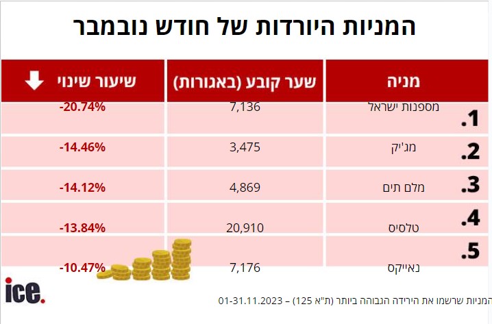 ברקע המלחמה ועל אף הדו"ח המוצלח, המנייה שחטפה הכי הרבה וצללה בלא פחות מ-20.74% עד רמה של 7,136 נקודות, היא מניית מספנות ישראל. אחריה ברשימת היורדות נמצאת מניית מג'יק שירדה ב-14.46% עד לרמה של 3,475 נקודות ואחריה נמצאת מניית מלם תים שירדה ב-14.12% עד רמה של 4,869 נקודות.