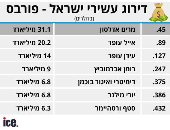 הונה של כוכבת הרשימה מרים אדלסון מתייצב על 31.1 מיליארד דולר, כשהיא במקום ה-45 בדירוג העולמי של מגזין פורבס. עידן עופר הפסיד שני מיליון דולר. רומן אברמוביץ מציין רווח קל, ומה מתרחש בגזרת יורי מילנר?